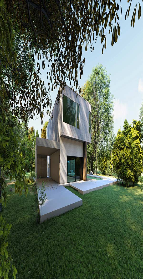 The whimsical feel of Villa Esther begins with the Neo-Modern gateway in the style of Le Corbusier's Villa Savoye.
